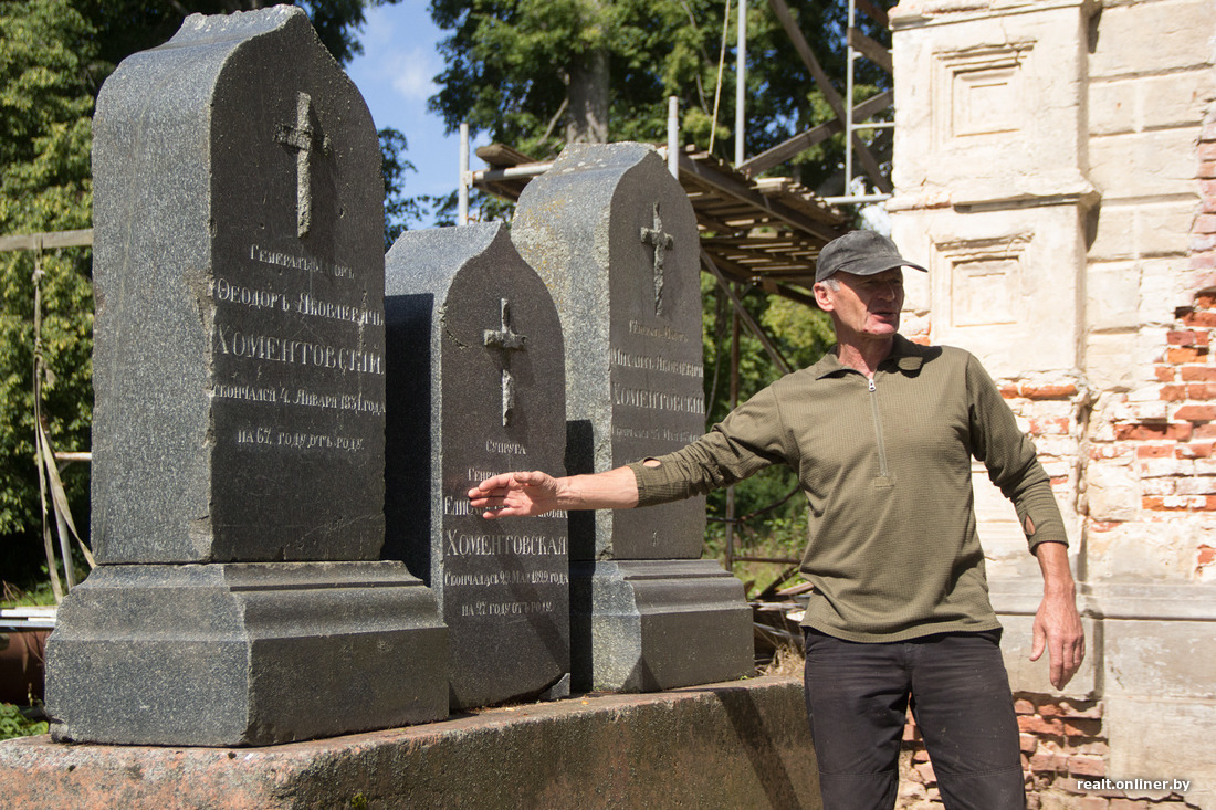— Помнік жонцы генерала знайшоў выпадкова, калі прастукваў ломам тэрыторыю. Пліта ляжала вунь там, далей, пад яблыняй. А пастамент Паўлу выявіў, калі чысціў завал усярэдзіне капліцы. Пакуль ён ляжыць на зямлі, але з часам і пастаўлю яго.